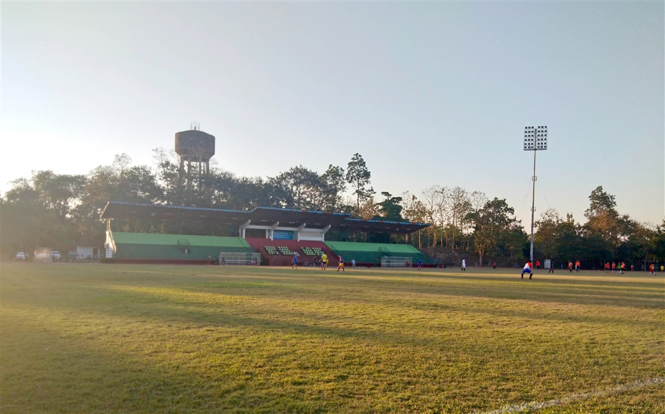 老撾國立大學(xué)的同學(xué)就很喜歡踢足球,足球場在學(xué)校的東面,球場正面是主席臺,側(cè)面還設(shè)有一處看臺,大約可以容納270名觀眾。跑道一圈也是400米,占地面積很大。球場中間的草是真草,有專門的人員養(yǎng)護。