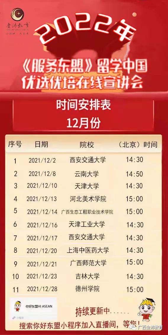 2021年12月2日起,由我司聯(lián)合多所高校開展的“2022年留學(xué)中國(guó)優(yōu)選優(yōu)培線上直播宣講會(huì)”將積極利用直播新形勢(shì)在“你好東盟”微信小程序上進(jìn)行開播。學(xué)校和師生、家長(zhǎng)可通過小程序你好東盟、Facebook和Youtube直播等多種途徑收看本次宣講會(huì)。