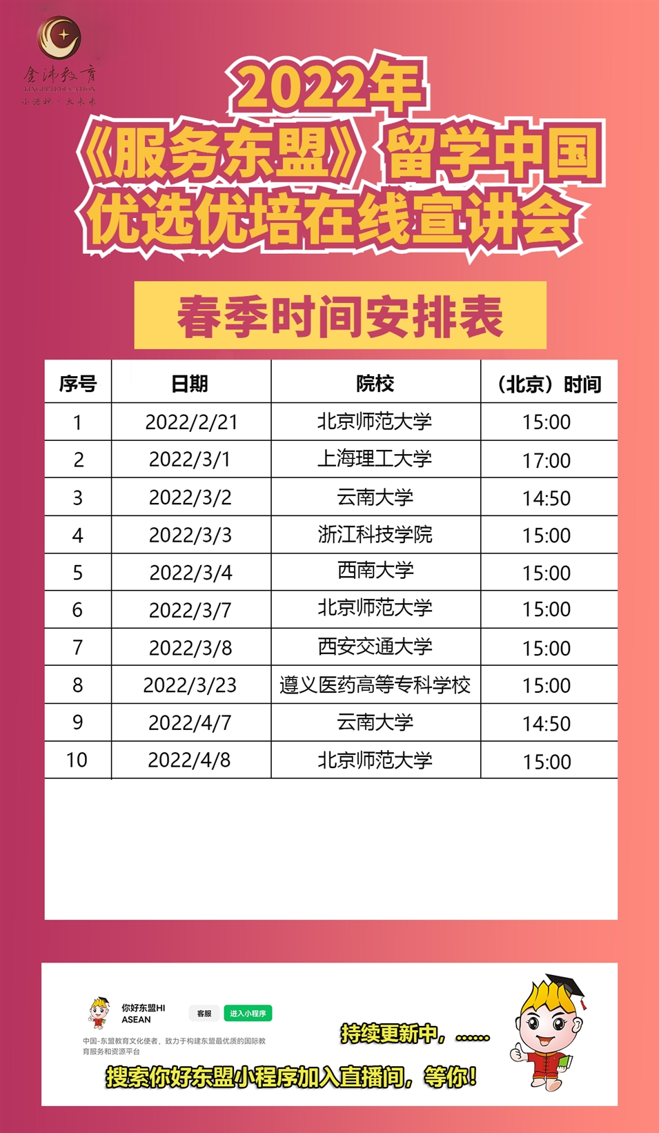2022年2月21日起由我司聯(lián)合多所高校開展的“2022年春季留學(xué)中國優(yōu)選優(yōu)培線上直播宣講會”將在“你好東盟”微信小程序上進(jìn)行開播。