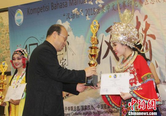 肖千為獲得大學(xué)組一等獎(jiǎng)的選手頒獎(jiǎng)并致辭。他說,“漢語橋”中文比賽已經(jīng)走過了17個(gè)春秋,吸引了包括印尼在內(nèi)的110多個(gè)國家的上萬名青少年參賽,成為國際人文交流領(lǐng)域的一大知名品牌。各國青年學(xué)生通過參加比賽,不僅提高了漢語水平,體驗(yàn)了中國文化,而且向中國和世界人民展示了各自國家的獨(dú)特文化風(fēng)采。