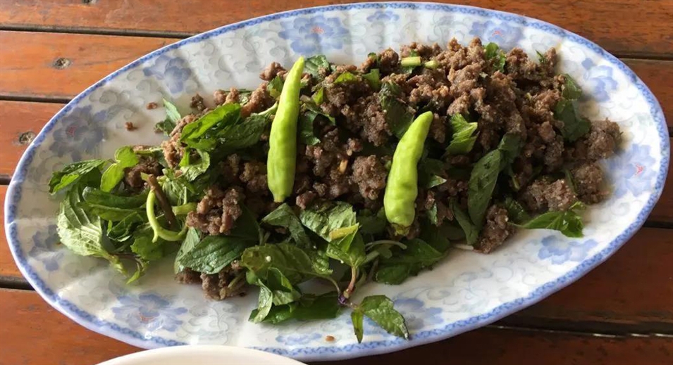老撾語叫Lahp,老撾最著名的代表菜之一,其做法是將新鮮的雞肉、豬肉、牛肉或魚肉剁碎,拌以魚露、辣椒、鹽、青檸、香茅、薄荷等多種佐料制成,味道鮮美獨特。這個特色菜分生、半熟和全熟,點的時候一定要說清楚,否則對于吃慣了熟食的人來說很難下咽。