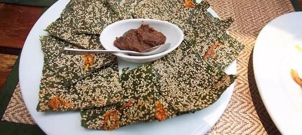 老撾是東南亞唯一的內(nèi)陸國,海產(chǎn)品相對周邊鄰國少了很多,可是流經(jīng)老撾的湄公河盛產(chǎn)河苔,是一道著名的下酒菜。這道菜的老撾名叫Khai Paen,將河苔片下油鍋炸至酥脆后撒上芝麻,搭配檸檬草、花生、蘸醬等一起吃,味道極其鮮美。