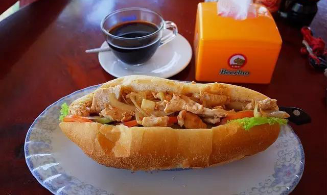 老撾語叫khao ji,之所以在老撾如此常見是跟法國的殖民歷史密切相關(guān),無論是餐廳還是路邊攤,法棍隨處可見,游客們最愛的還是將法棍面包切成兩半后夾入一些雞肉、牛肉、火腿、豬肉、雞蛋、蔬菜等不同餡料和醬料,制成三明治,既美味又實惠。