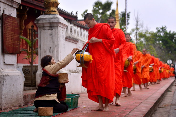 瑯勃拉邦的寺院是不開伙的,僧人每天清晨赤腳走向大街小巷尋求布施,信徒們鋪張席子,跪在路旁,每天將清晨親手做的第一鍋米飯贈(zèng)與僧侶,成為瑯勃拉邦一道獨(dú)特的風(fēng)景線。