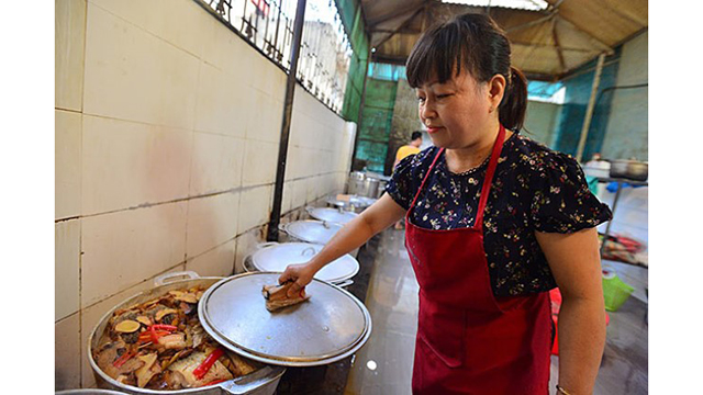 當(dāng)時鐘剛剛走到5點,阮友誼與范氏青恒夫婦家庭的十幾個人就已經(jīng)起床了。阮友誼先生跟他幾個孩子、孫子熟練地將魚劐開、清洗然后將草魚切成大于兩個成年人拳頭的魚塊、洗干凈并晾干水分,等“老板娘”腌制并將魚放入鍋中