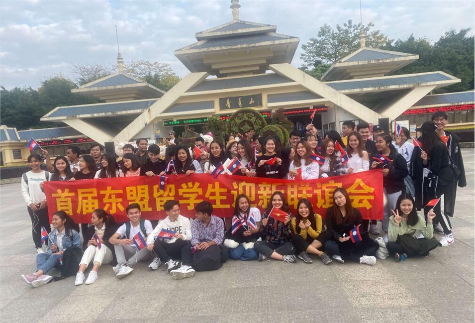 圖為東盟留學(xué)生于青秀山大門前合影
