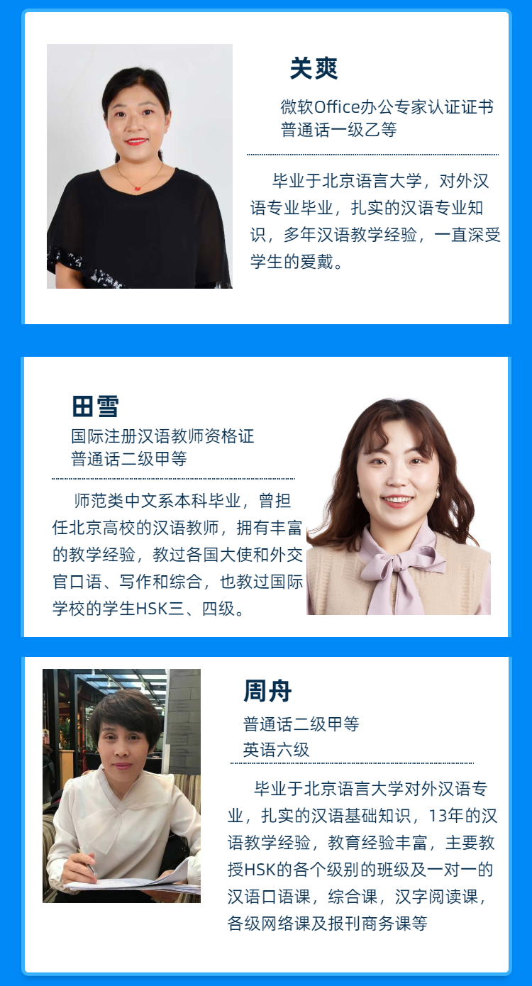 金沛漢語學(xué)院擁有雄厚師資力量和優(yōu)秀的教師團隊,中國名校名師在線課堂,扎實的專業(yè)知識、漢語考試技巧、方向,根據(jù)學(xué)生目標(biāo),制定適合的教學(xué)計劃,助你順利過關(guān)!