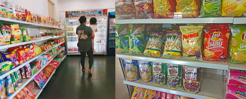 食堂區(qū)的小商店我們在《我在老撾國立大學的生活—食堂篇》中介紹過,其實可以猜到,既然開在食堂,那售賣的物品當然以食物為主,比如紅牛、牛奶、果汁、汽水之類的飲料應有盡有,當然,薯片、餅干也是必不可少的。