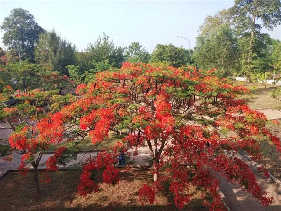 宿舍區(qū)有一片小森林,午后或者晚間,可以跟朋友一起散步,特別是炎熱的夏季,感受習(xí)習(xí)涼風(fēng),整個(gè)人神清氣爽,四月的宿舍樓下環(huán)境很迷人的,樹木長滿了紅花,就像火熱的天氣,好像在宣告著:夏天來了