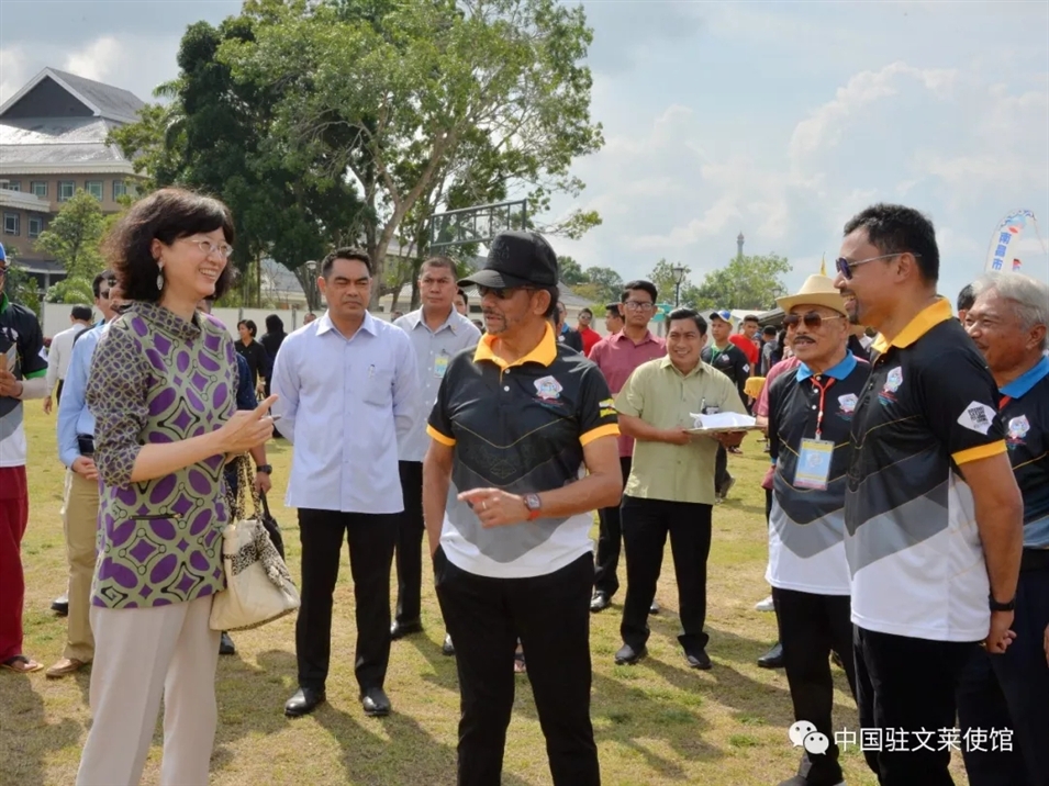 3月17日,于紅大使應(yīng)邀出席文萊首屆國際風箏節(jié)開幕式。于紅大使在開幕式前看望中國選手,為他們加油鼓勁。于紅大使還陪同文萊蘇丹、王儲等王室成員和中國選手交流。